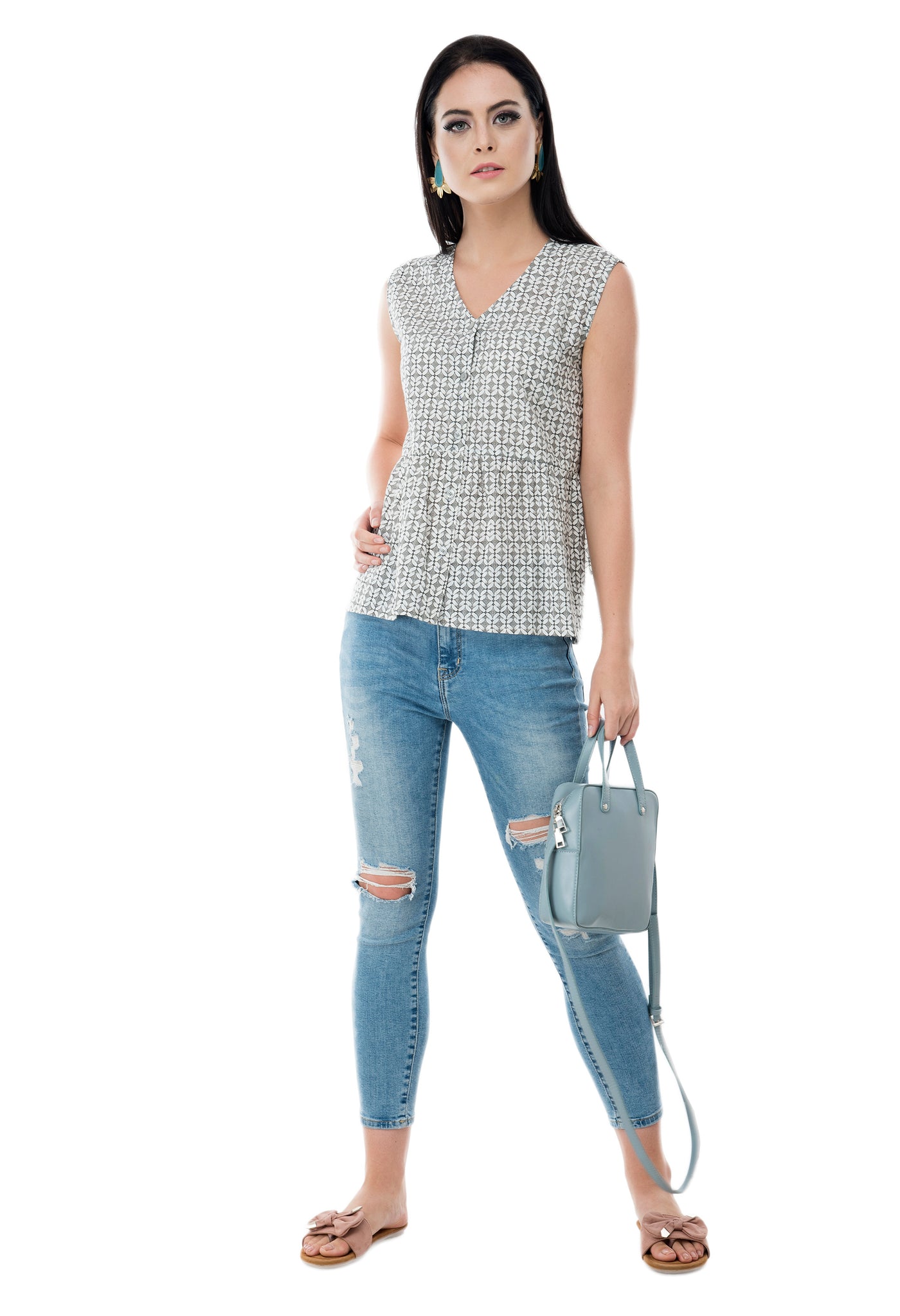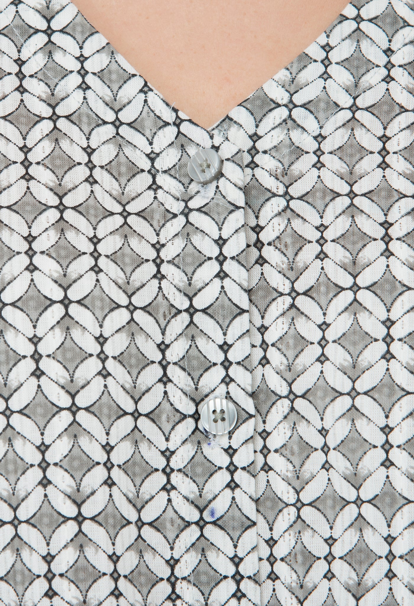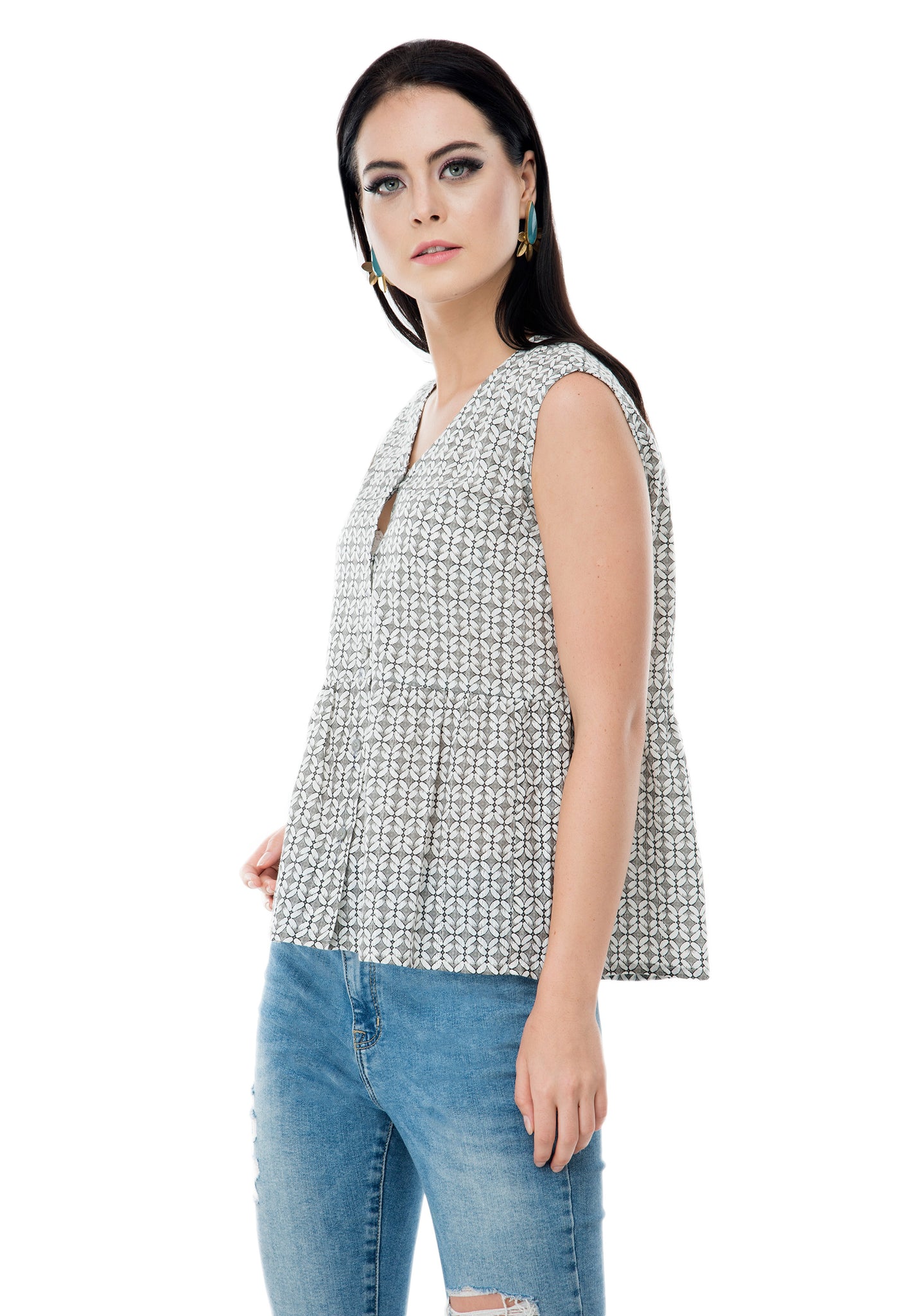 A V neck sleeveless printed grey button-down top in breezy fabric for your lunch date with friends
