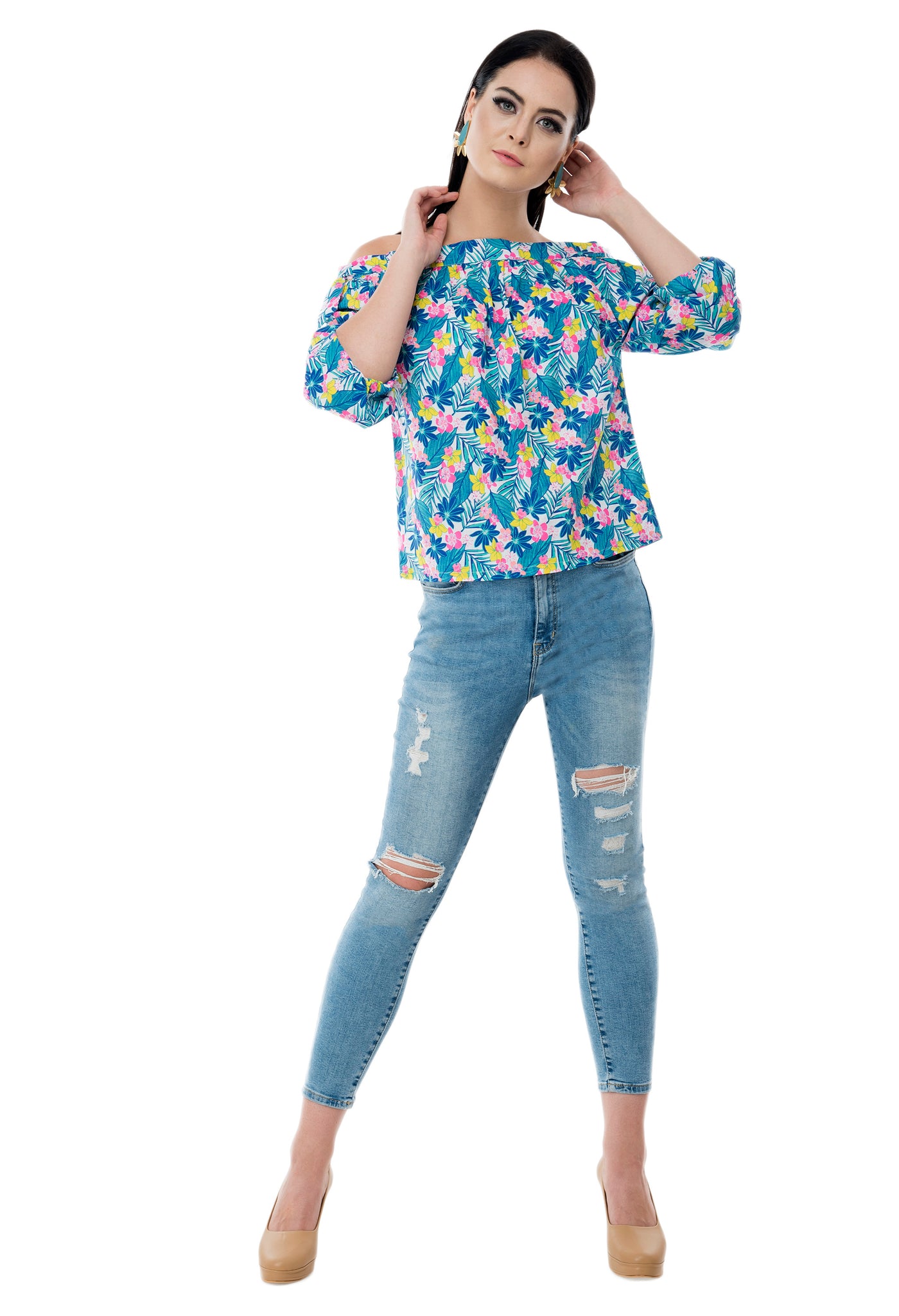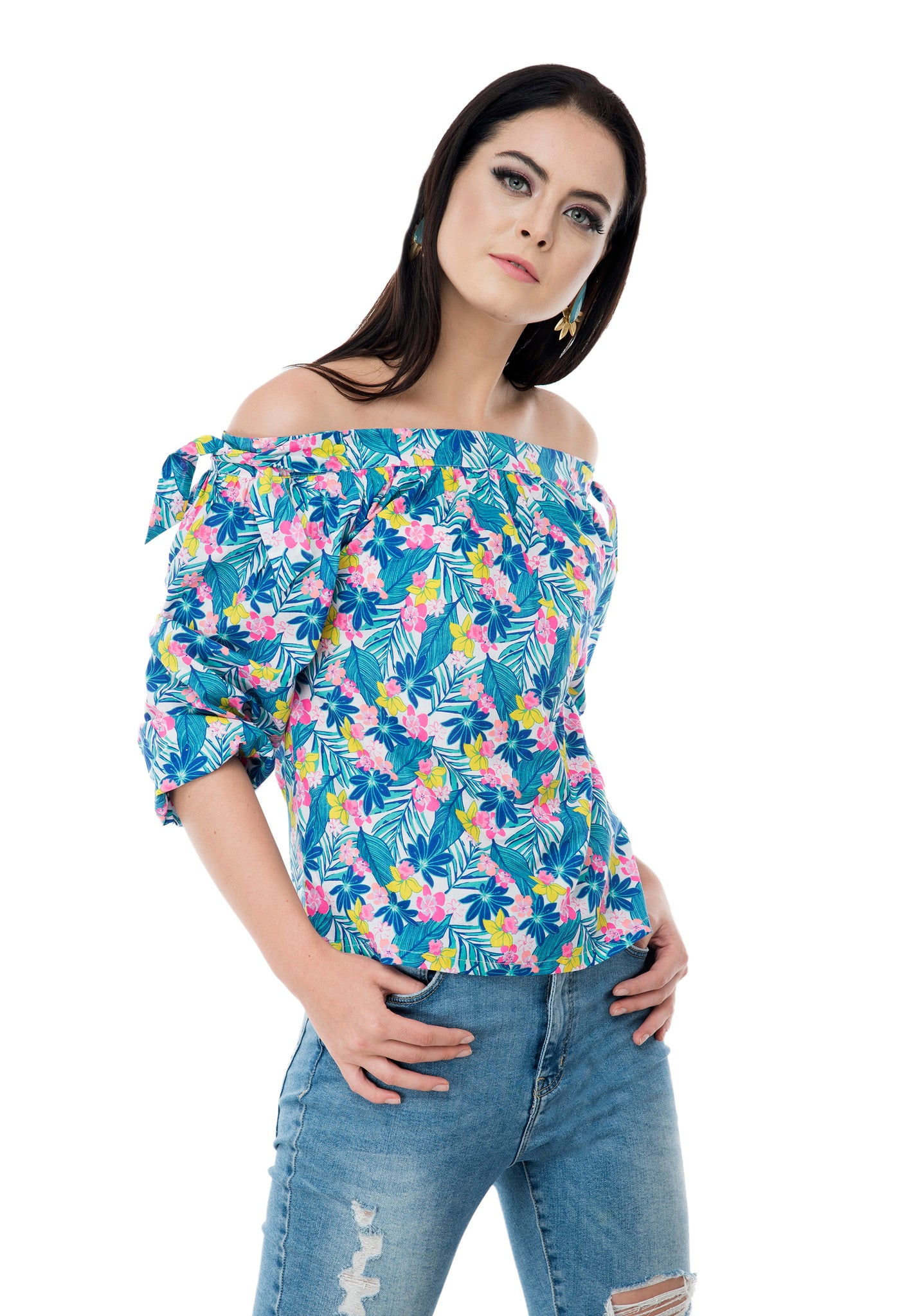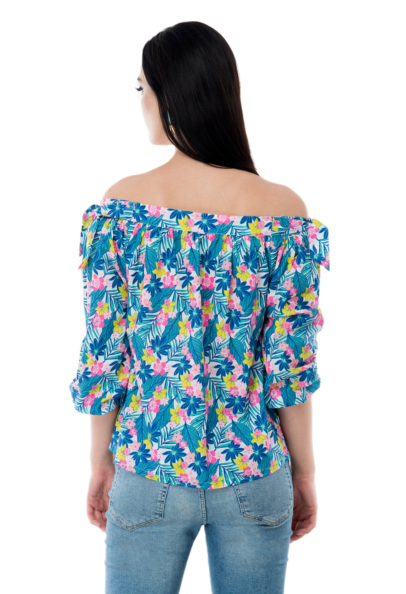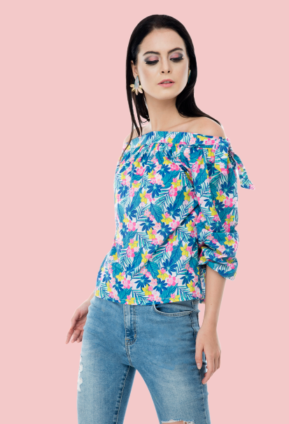 A three- fourth floral blue and pink tropical print in cotton bow detailing off shoulder Top