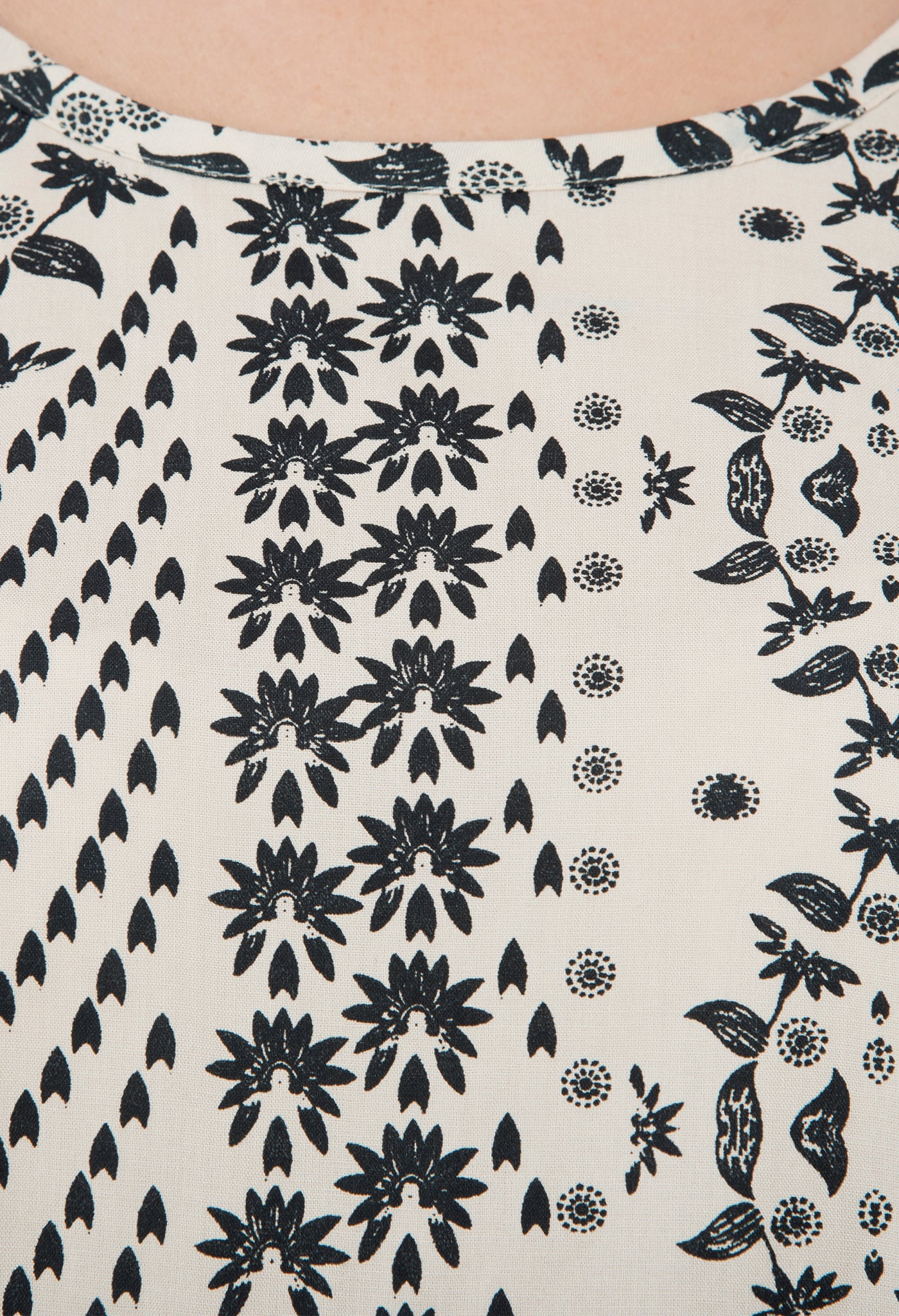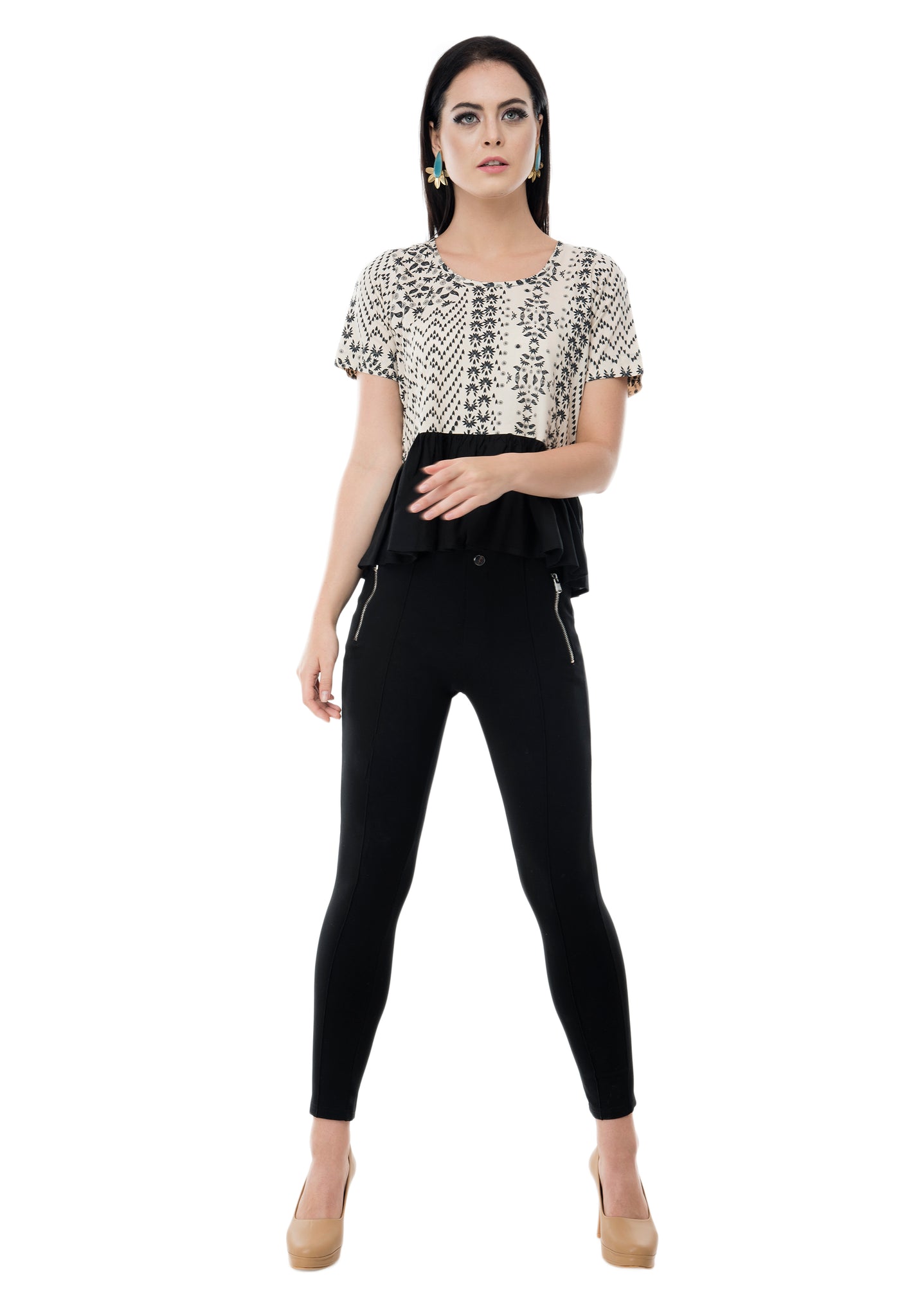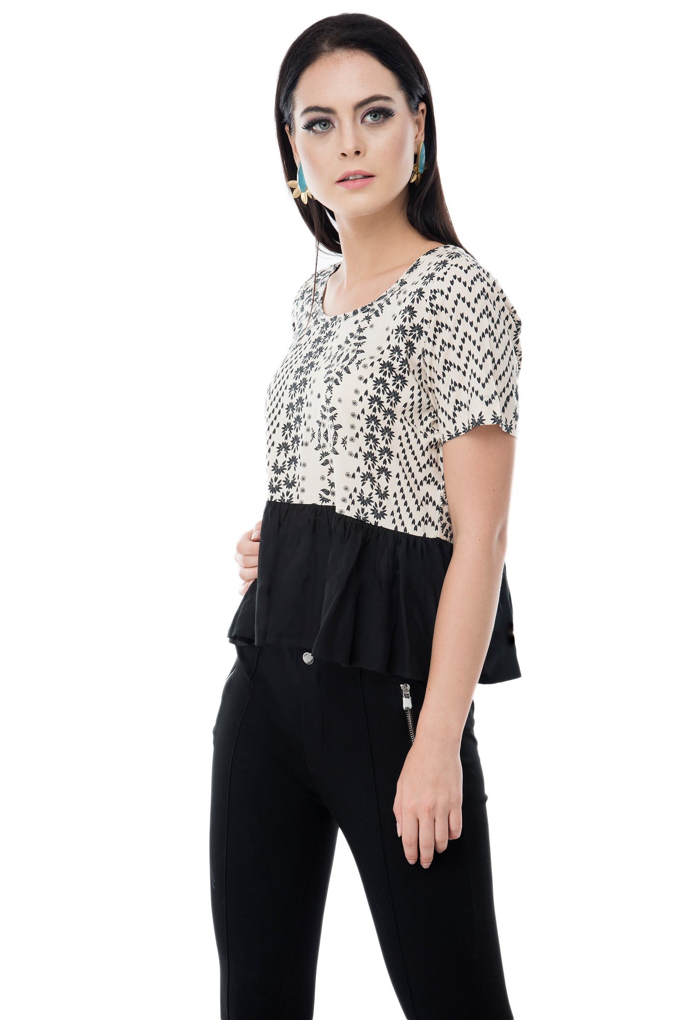 A half sleeve cream and black astec print in rayon a peplum top for a casual outing.