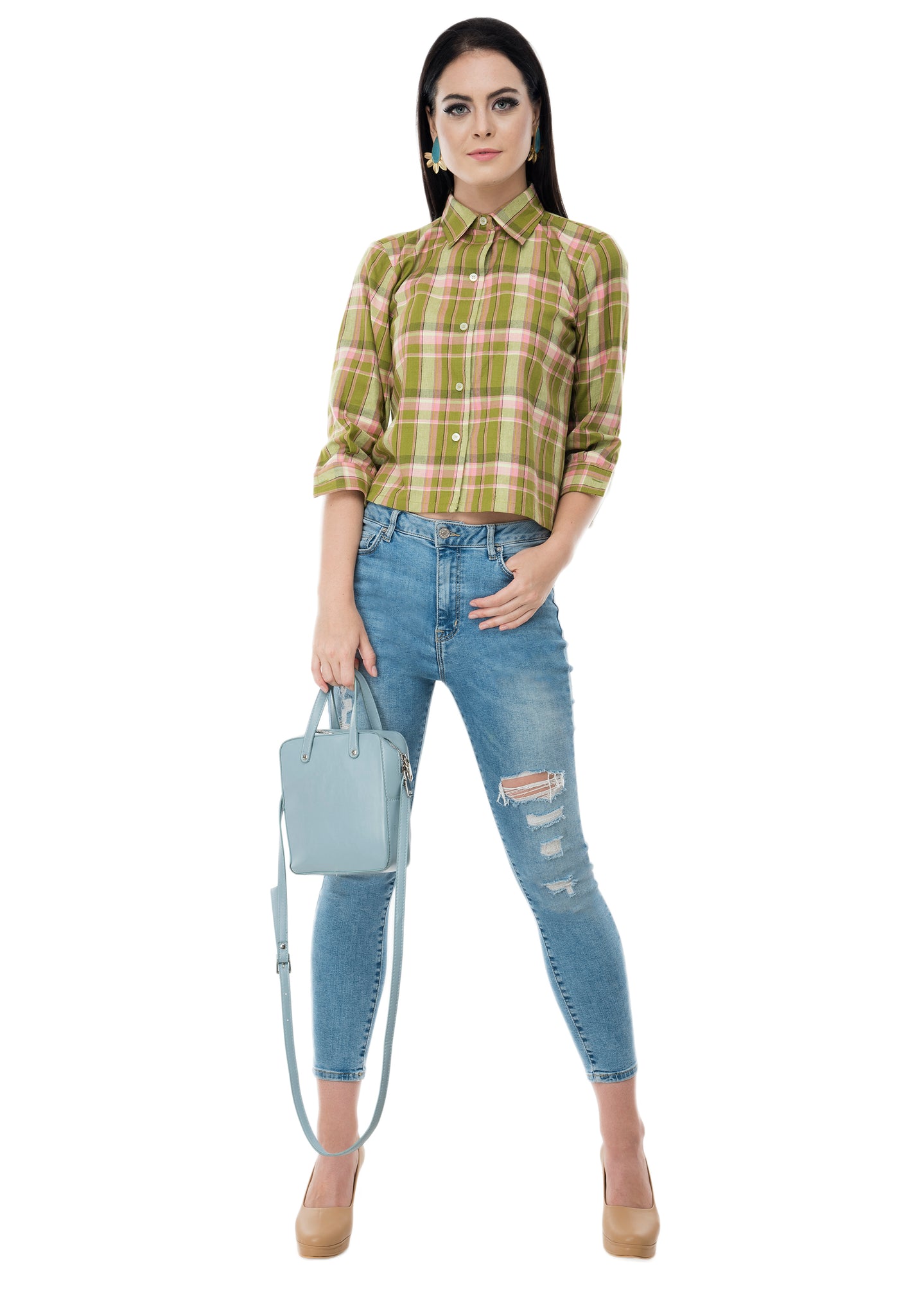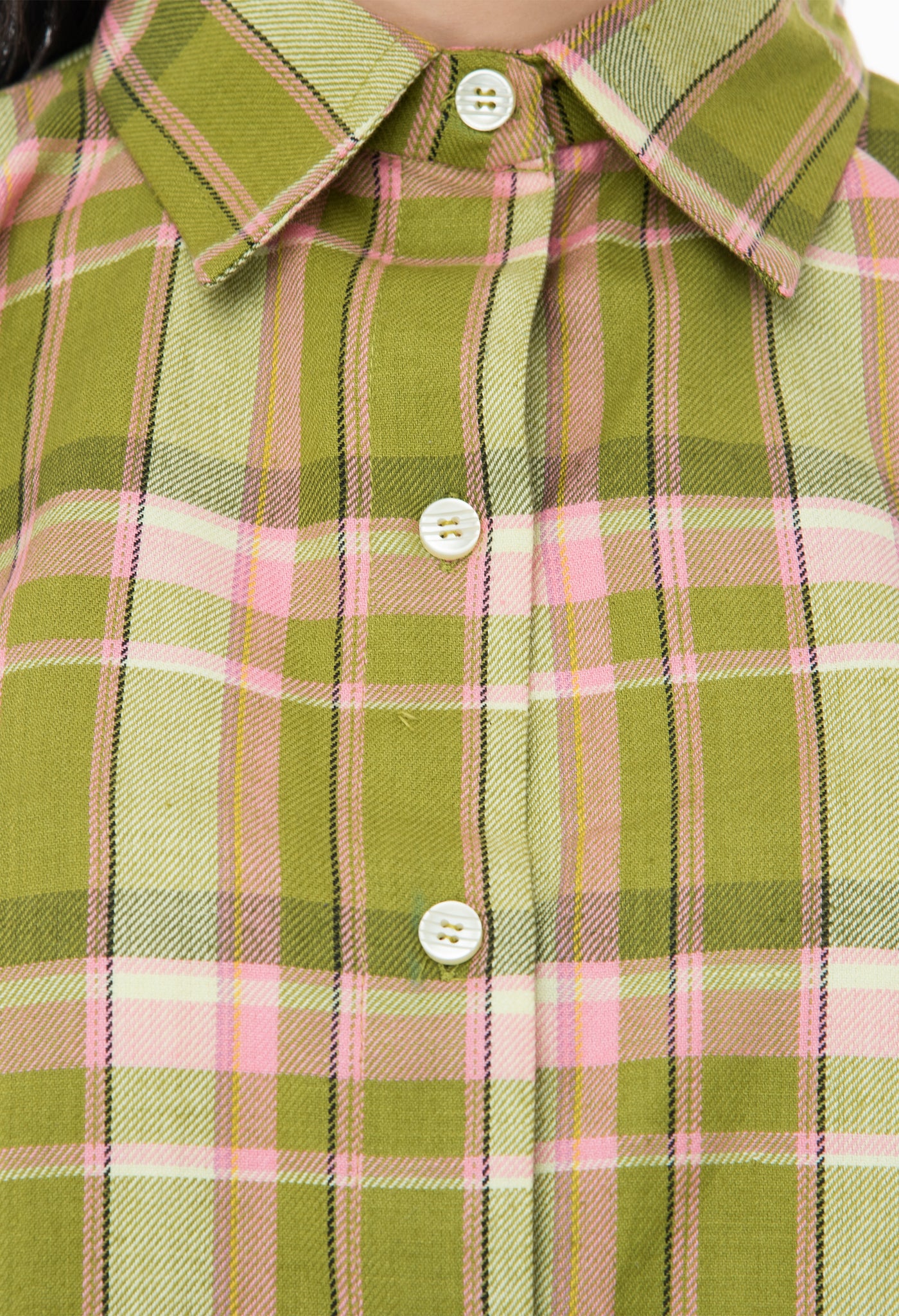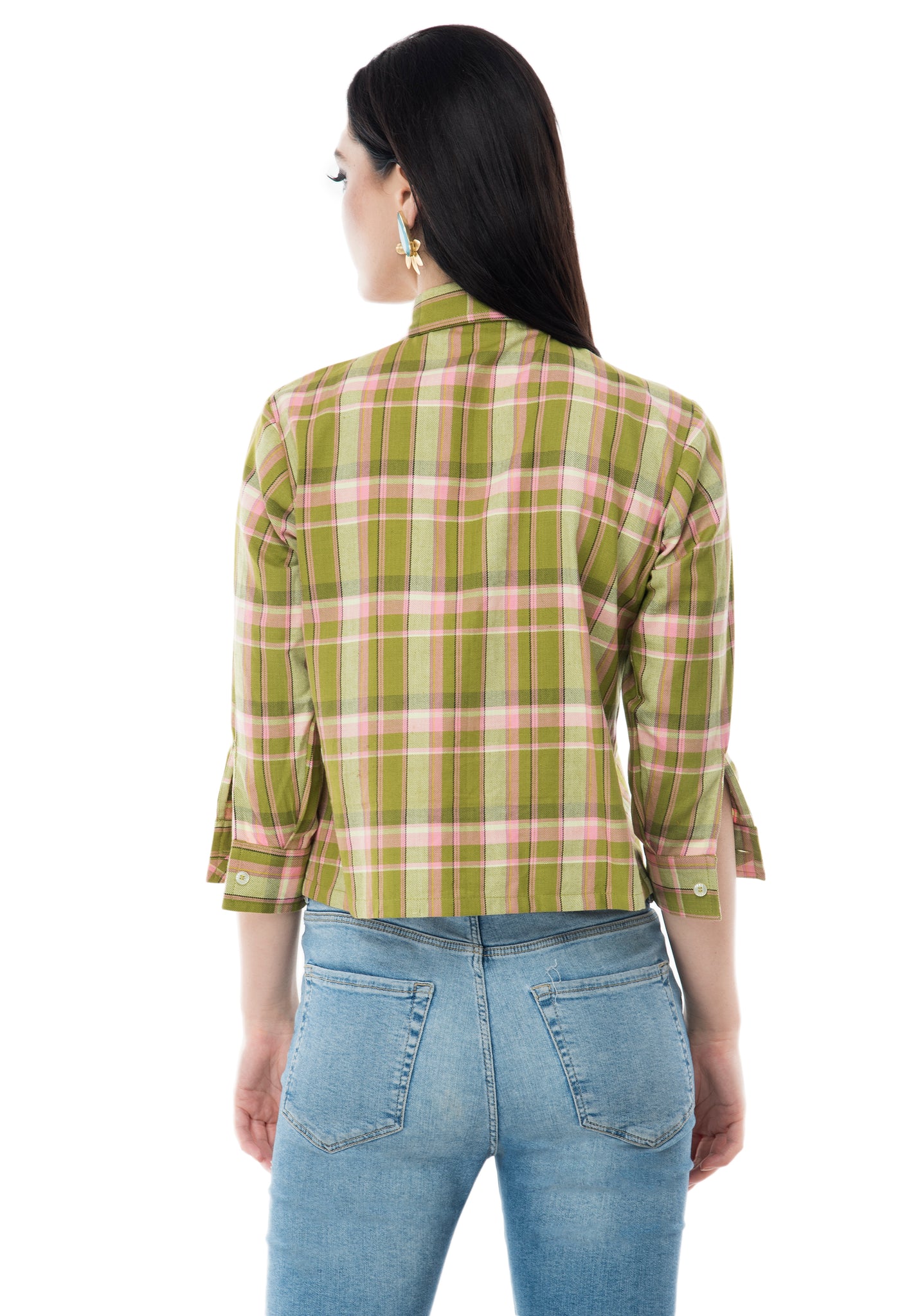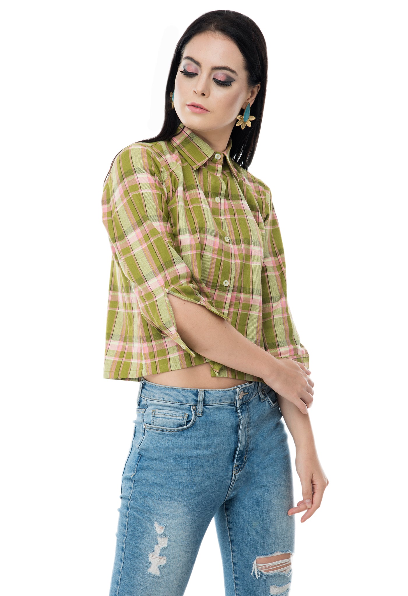 A three fourth retro style pink and green checkered crop shirt to be paired with boyfriend jeans.